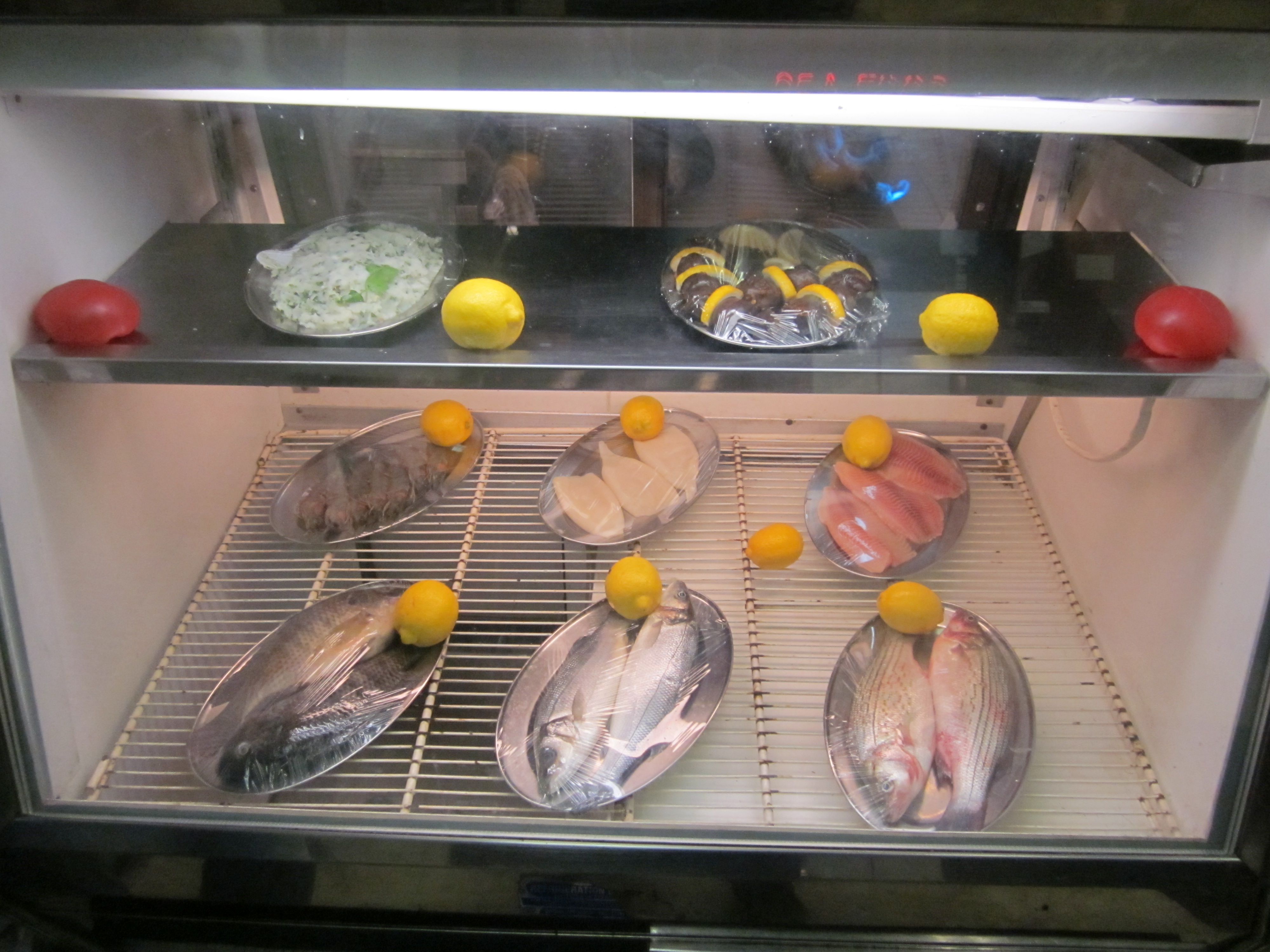 Zio and I arrived first and besides a woman sweeping the floor and another in the kitchen, we were the only people in Morgan’s. There were fresh fish displayed under a glass counter along with a platter of potato salad and small, pickled eggplants. The woman sweeping offered many friendly smiles, but either didn’t have much to say, or was hesitant because of language difficulties.