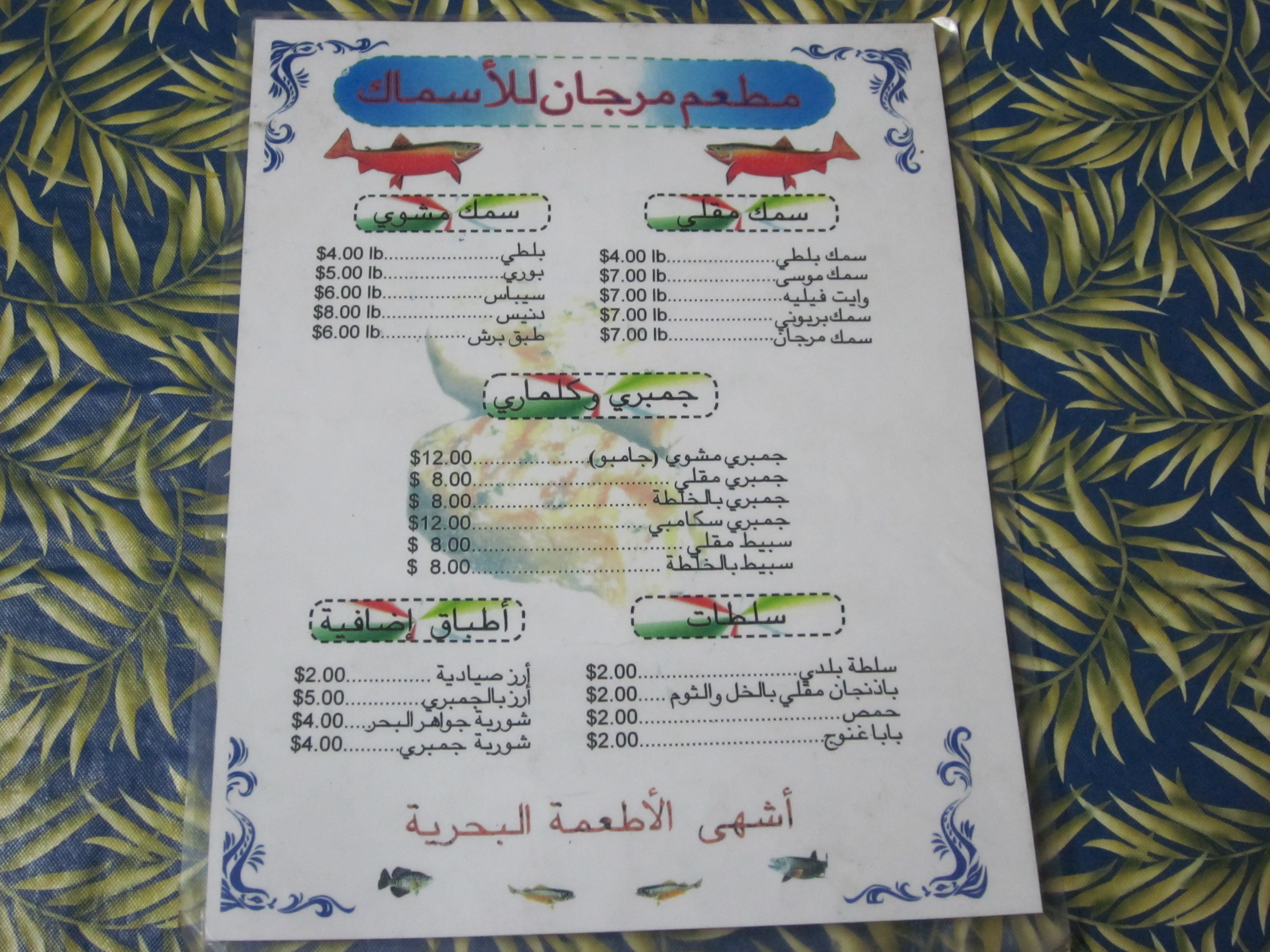 A man appeared. He did speak English and also possessed a friendly smile. He pointed to the fish; tilapia, striped sea bass, and branzino. There were also large, full-bodied shrimp and a few flattened pieces of uncooked calamari minus the tentacles. He could prepare the fish, he said, either fried or grilled.