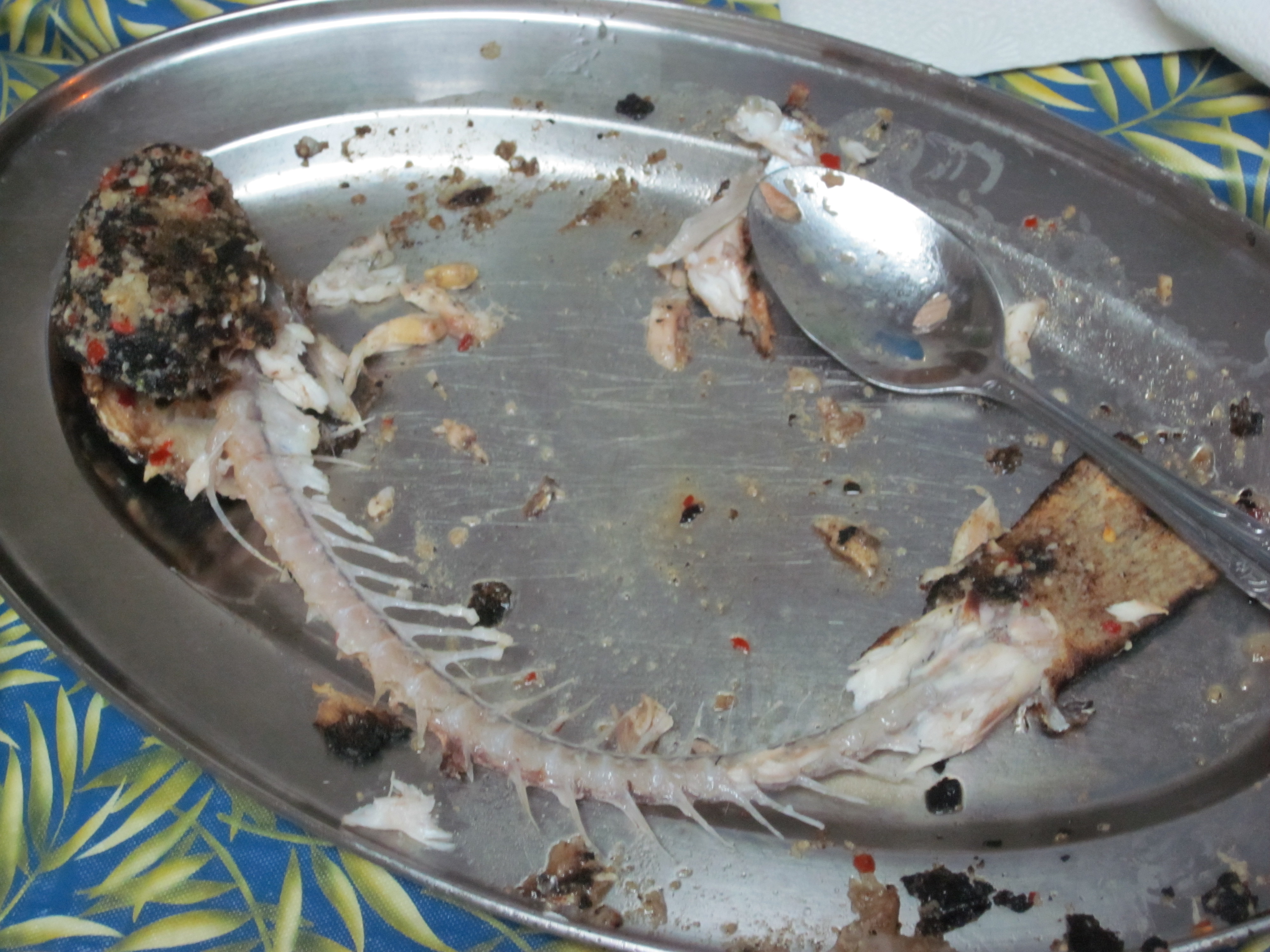 The fish was served with a brown (not health food brown) rice and a sofrito-like sauce. We took turns excising the flesh from the bones until all that remained were their skeletons.