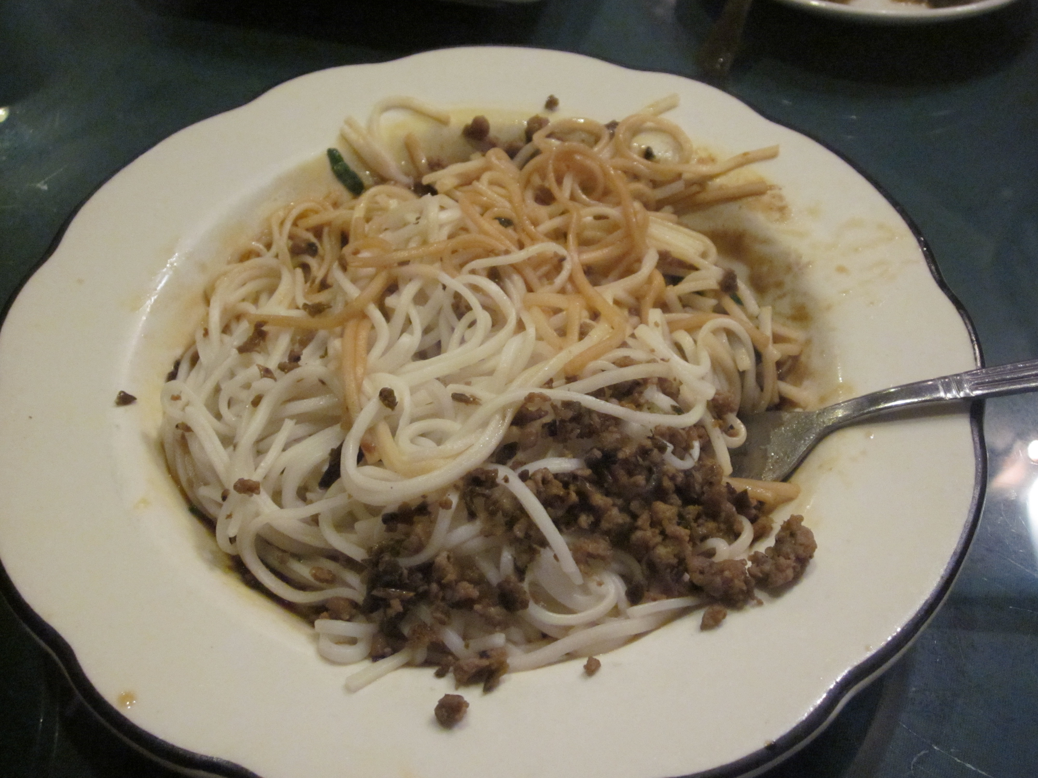 We approached the ox tongue and tripe hesitatingly. Rick was even more apprehensive thinking there might be chopped nuts; cashews, almonds, or walnuts, in the dish. We didn’t want to have to insert Zio’s soda straw as a breathing tube if Rick’s throat constricted due to an allergic reaction to the nuts. Peanuts were apparently okay, and that’s what we believed was in the dish along with chilies and tender slices of ox tongue and tripe. So Rick threw caution to the wind and speared a few slices with his chopstick.