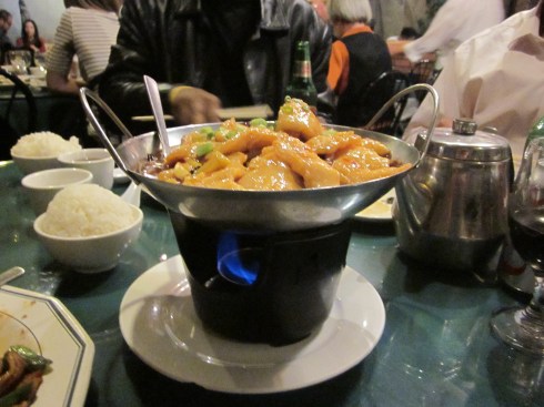 Zio wanted fish; he just wasn’t sure which one; the options were plentiful. He finally decided on fish and sour cabbage in a “little hot pot.” Rick splurged and ordered the tea smoked duck, while Gerry deliberated between mushroom with “grandma’s” sauce which would have been worth it for the name alone and our waiter’s recommendation; something called “sautéed sponge gourd.”