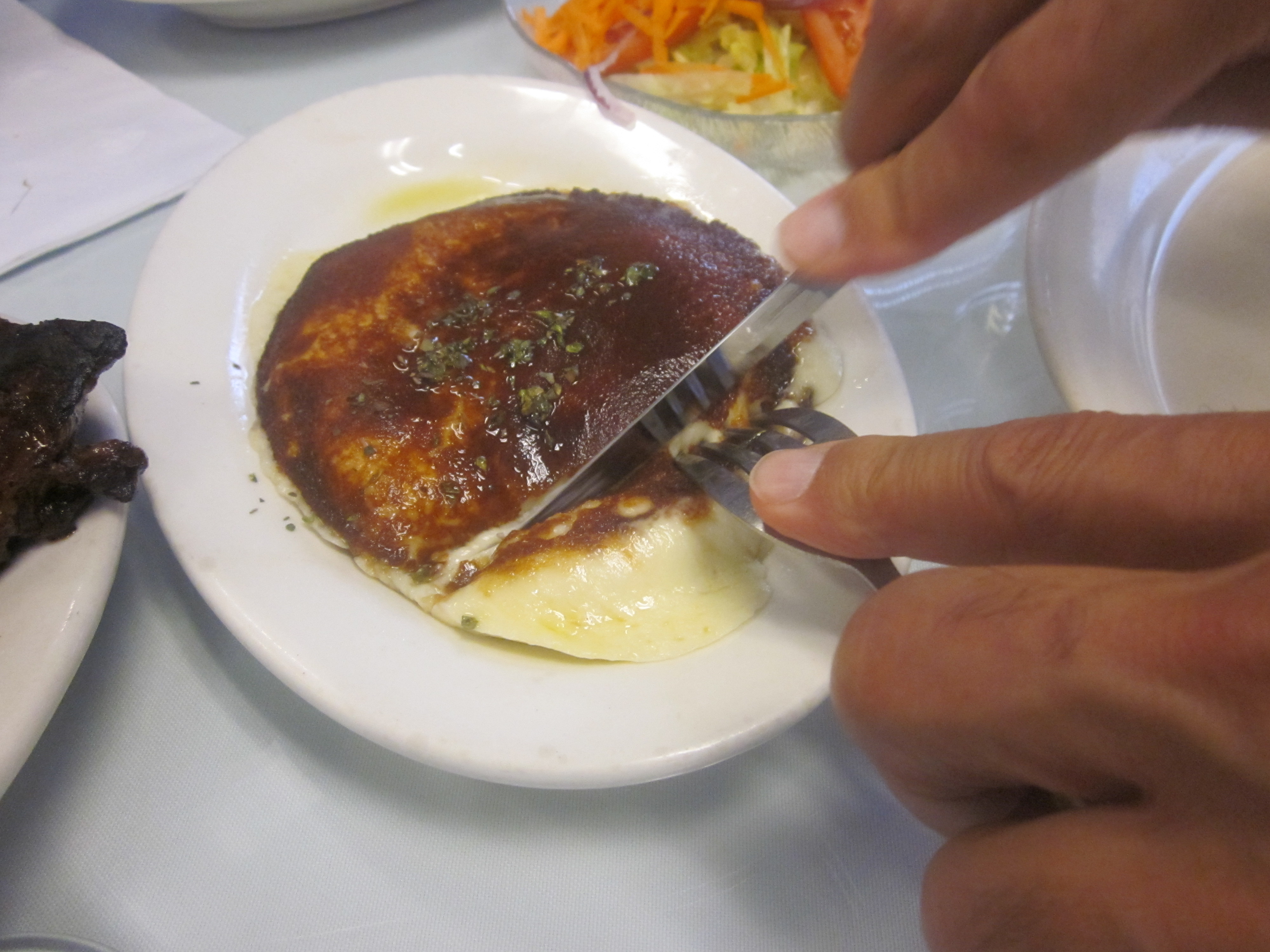 While we decided what to order, we were brought toasted bread and slices of grilled sausage. We knew we had to be careful how we ordered, but the temptations were many. The empanadas, of course were a must. A “parrillada completa,” or combination of a variety of meats made sense, despite the $38 price (for two). With it we would get to sample skirt steak, short rib, sweetbread, tripe, kidney, black and Argentinean sausage. To that we added another skirt steak for two, a flank steak, and an appetizer of grilled provolone in oregano sauce.