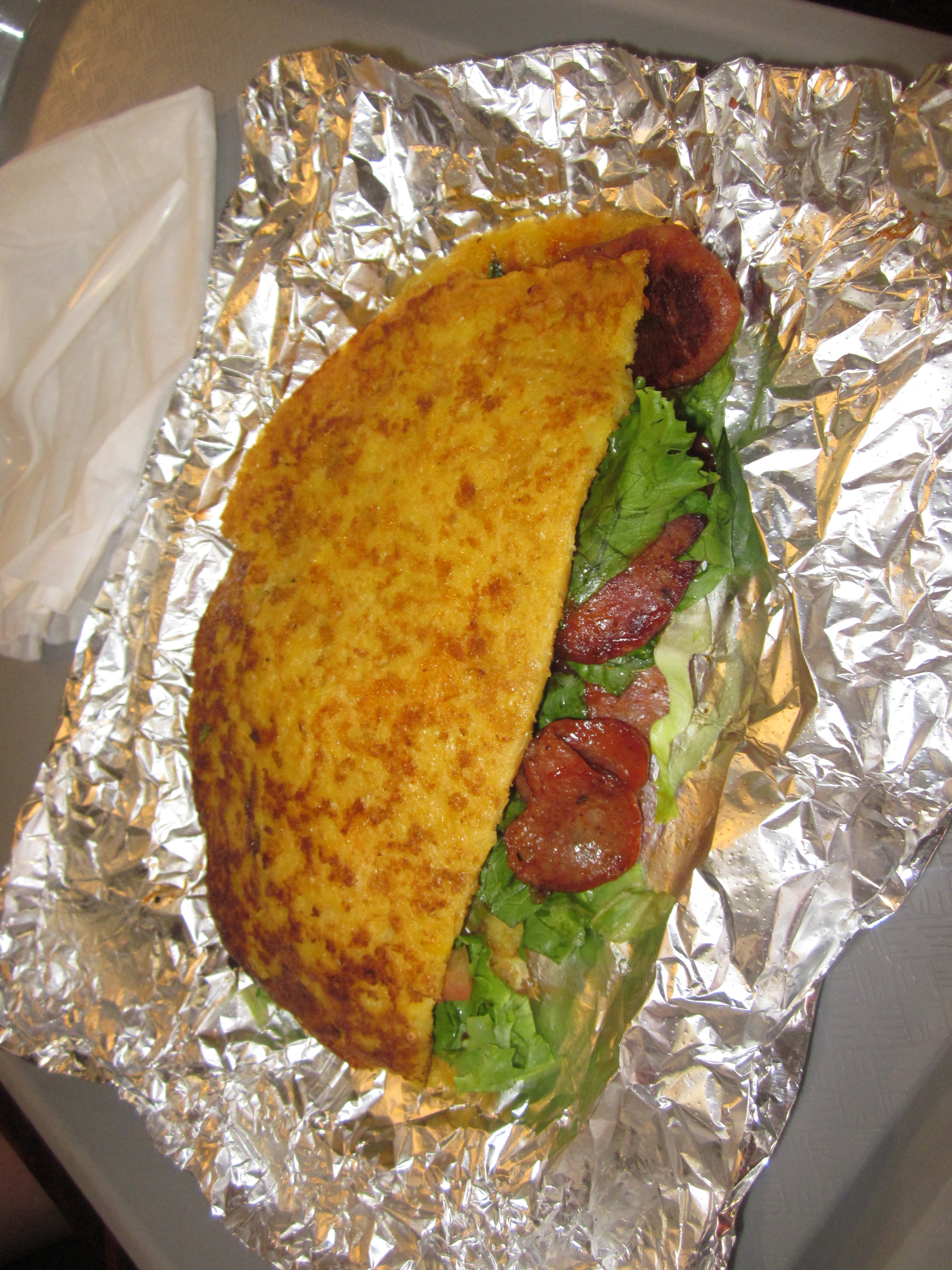 There was a small booth on Dyckman street where corn along with other farm fresh goods were being sold. Across the street a vendor was selling roasted corn and batata (sweet potato) cooked on a gas grill. Further down the block another vendor had homemade empanadas hanging on hooks inside his makeshift cart. This was the scene I encountered on Dyckman Street on a humid summer evening on the way to Cachapas y Mas, the Veneuzuelan fast food place Zio had chosen for our group.