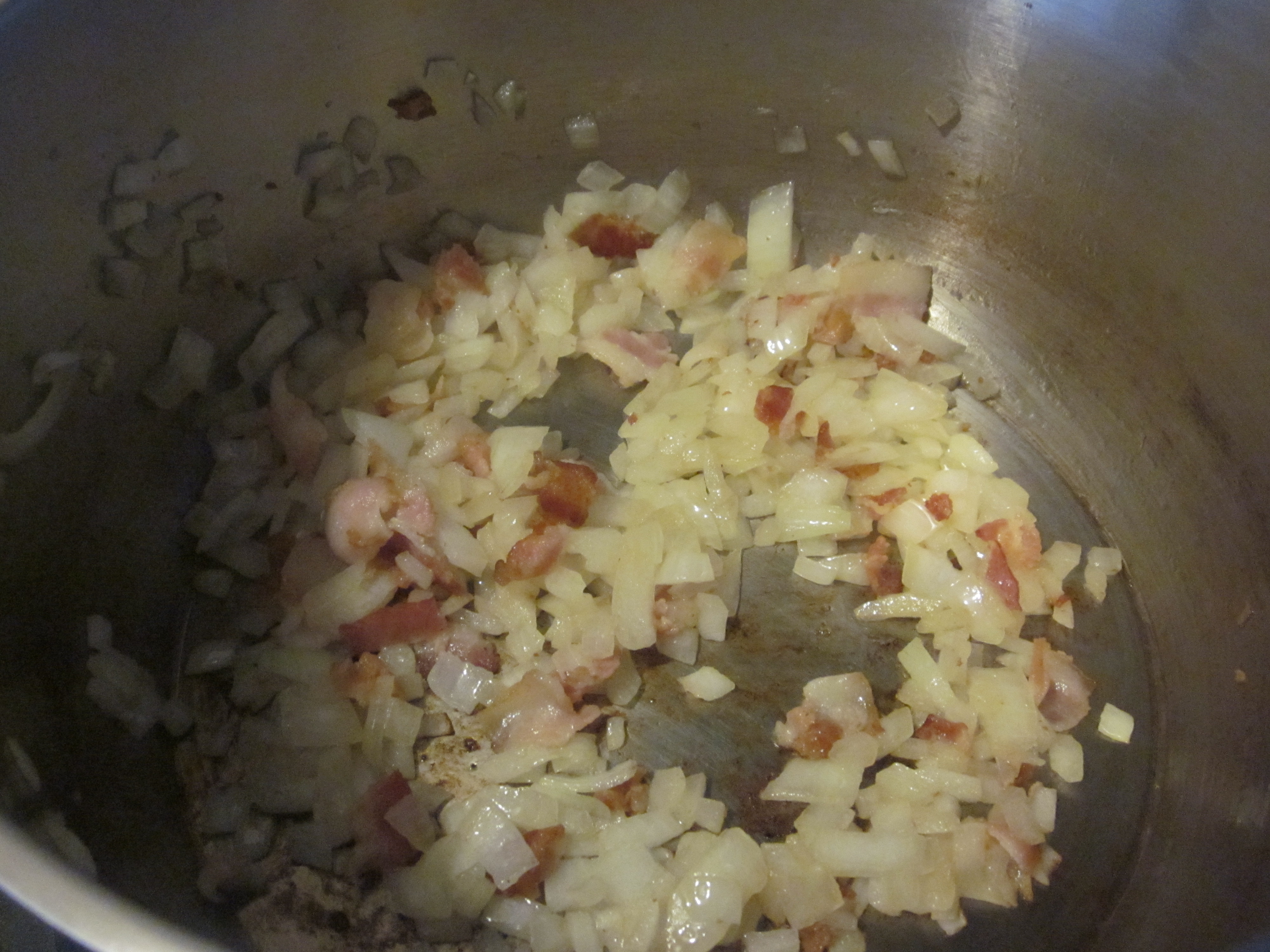 Add the onion and fry in the bacon fat for about five minutes or until softened.