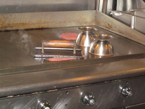 From my seat I watched as a generous patty/slab of meat was tossed onto the hot griddle and then covered with a bowl to steam heat it through.