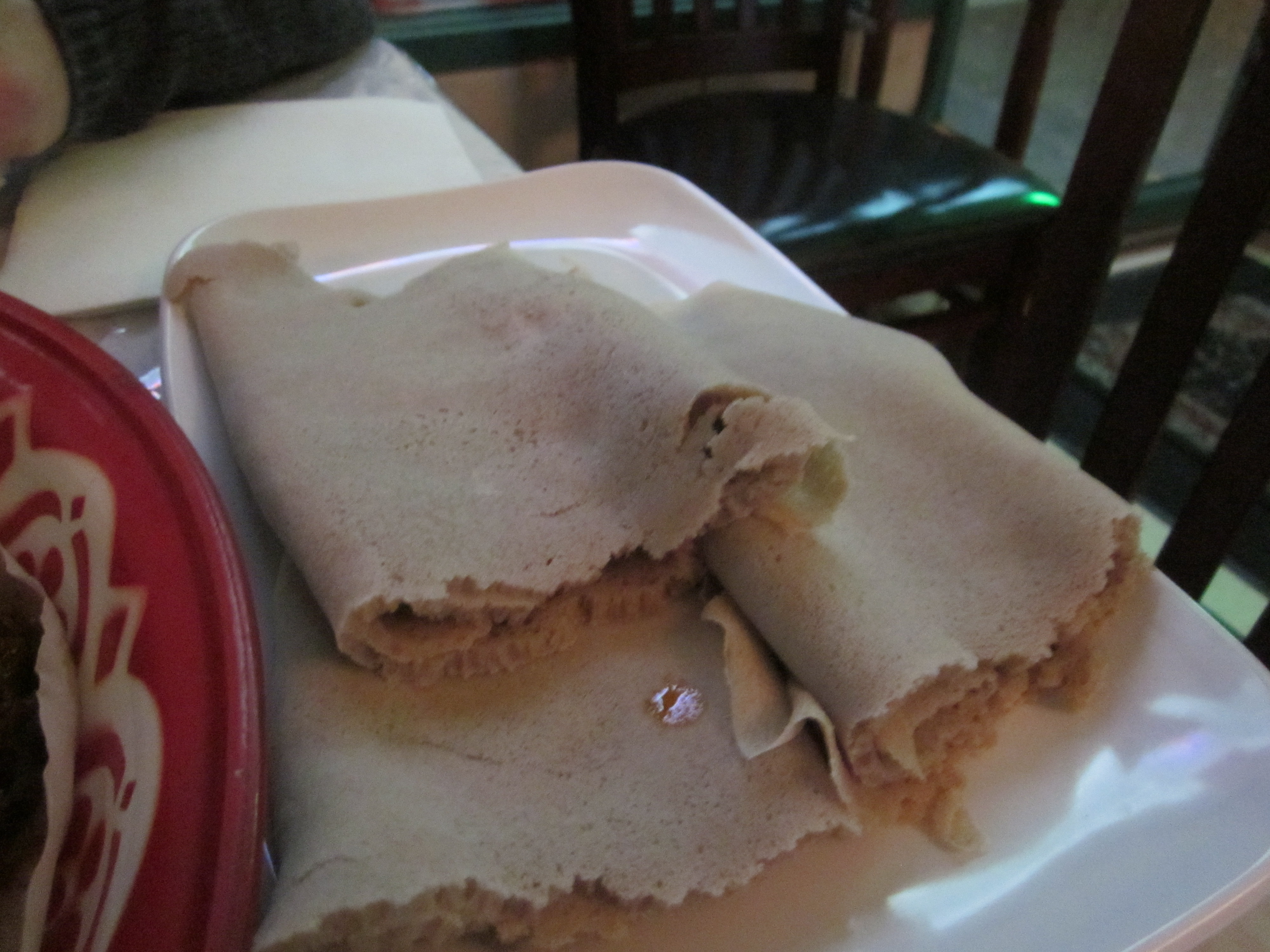 Along with the platter, we were given an additional plate of injera. There were no forks, spoons or knives on the table. With bread like this, who needed utensils? We scooped up the meat and veggies with the accompanying injera and shoved it into our mouths, doing our best not to let anything fall our already food-stained clothes.