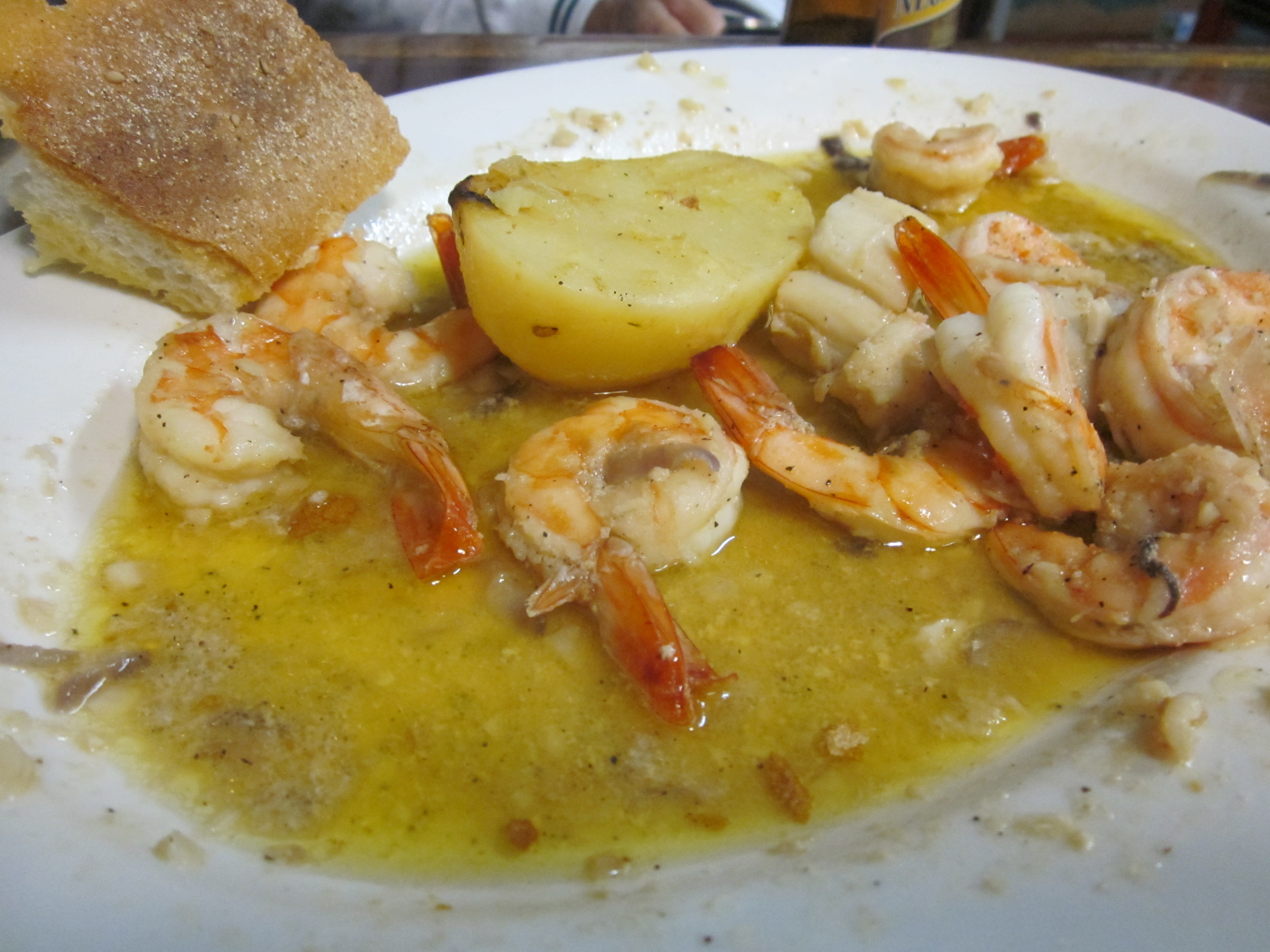 The addictive crunchy bread had long since disappeared and when the shrimp and scampi arrived on a gargantuan platter swimming in garlicky oil also flavored with lemon, we knew we needed more bread to soak up the “juice.”