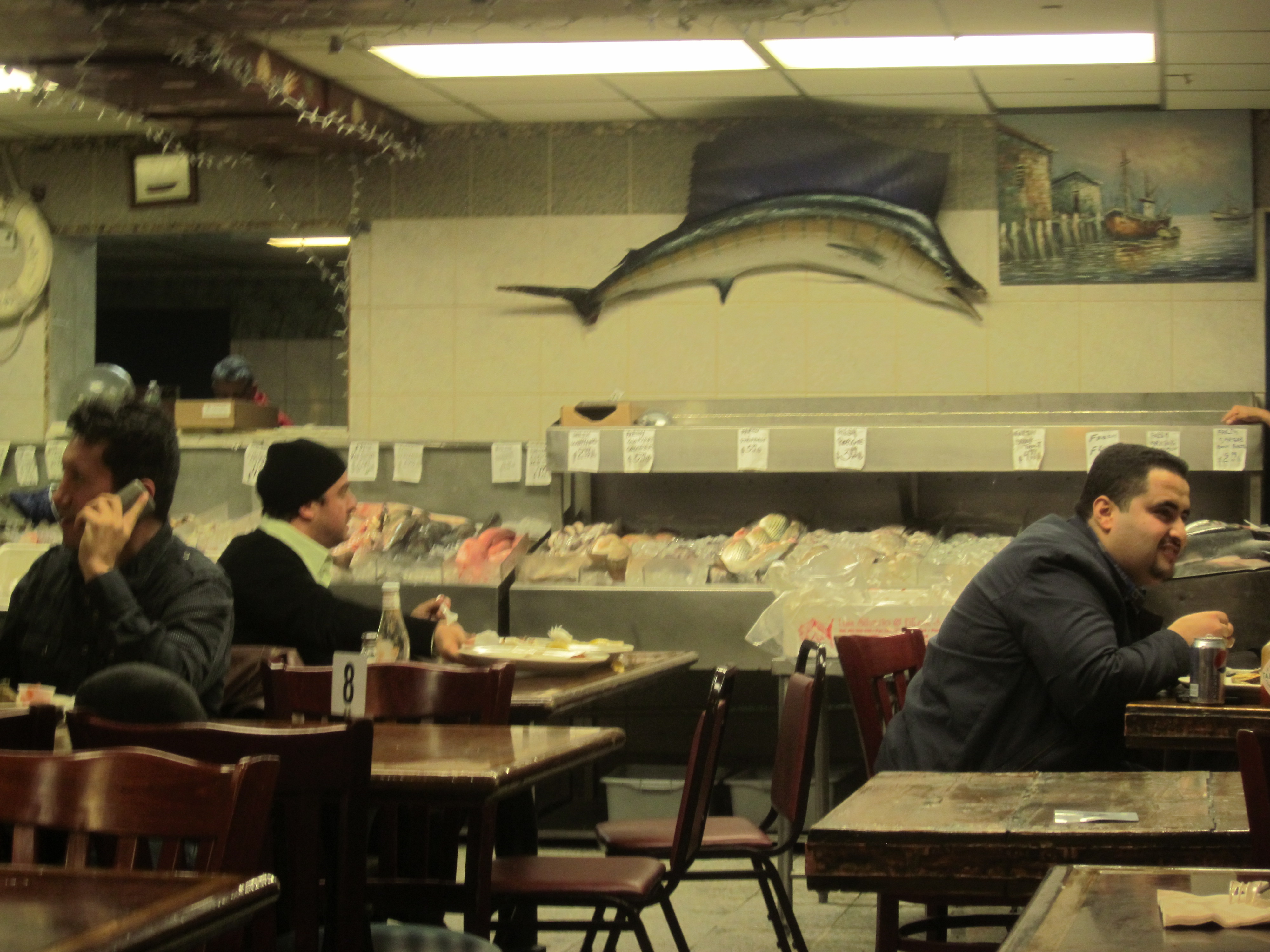 When I arrived, Zio was in the process of securing our table in the combination seafood market and restaurant. The place was bustling; maybe others were observing Ash Wednesday by confining their diet that evening to fish. I could hear Spanish, Greek, and Arabic spoken from the customers (mostly men) at the restaurant’s tables as Zio and I surveyed the offerings on ice.