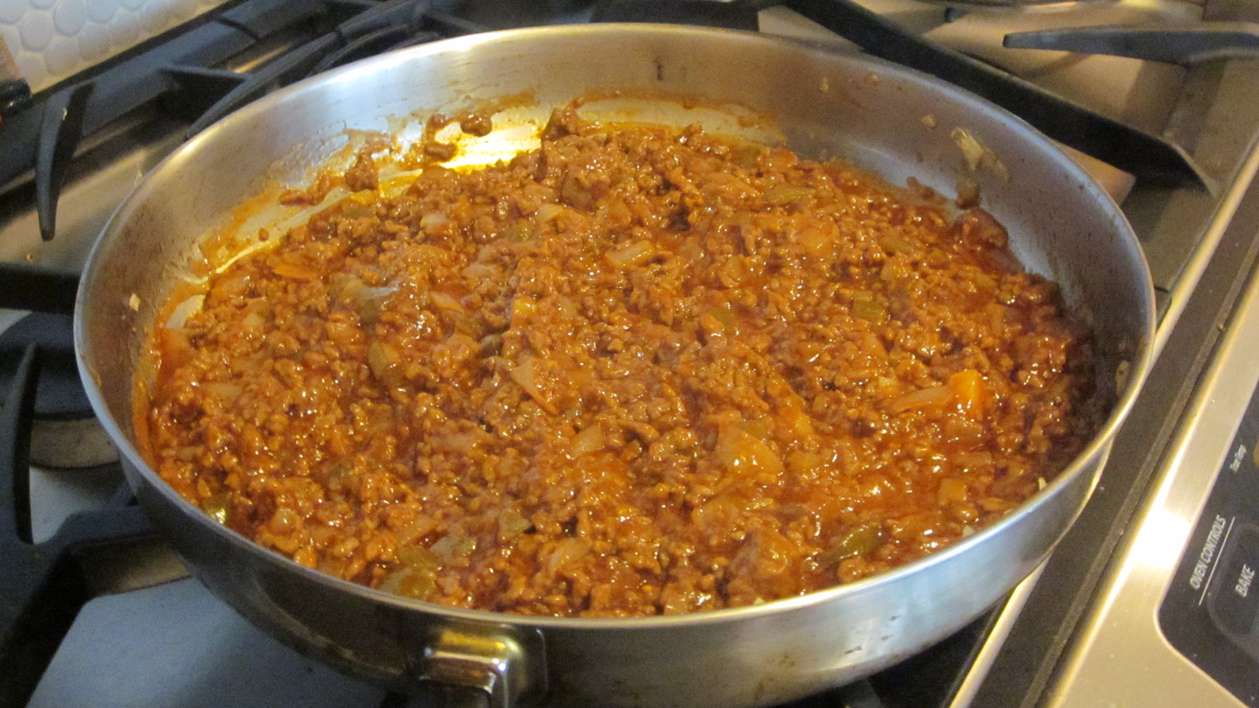 Making the Sloppy Joe really was about as easy as it gets. I followed the directions, cooking the peppers and onions, adding the beef, skimming off the fat, and then pouring in the ketchup, the brown sugar, Worcestershire sauce, salt and pepper and then cooking it on medium heat for about ten minutes until it thickened.