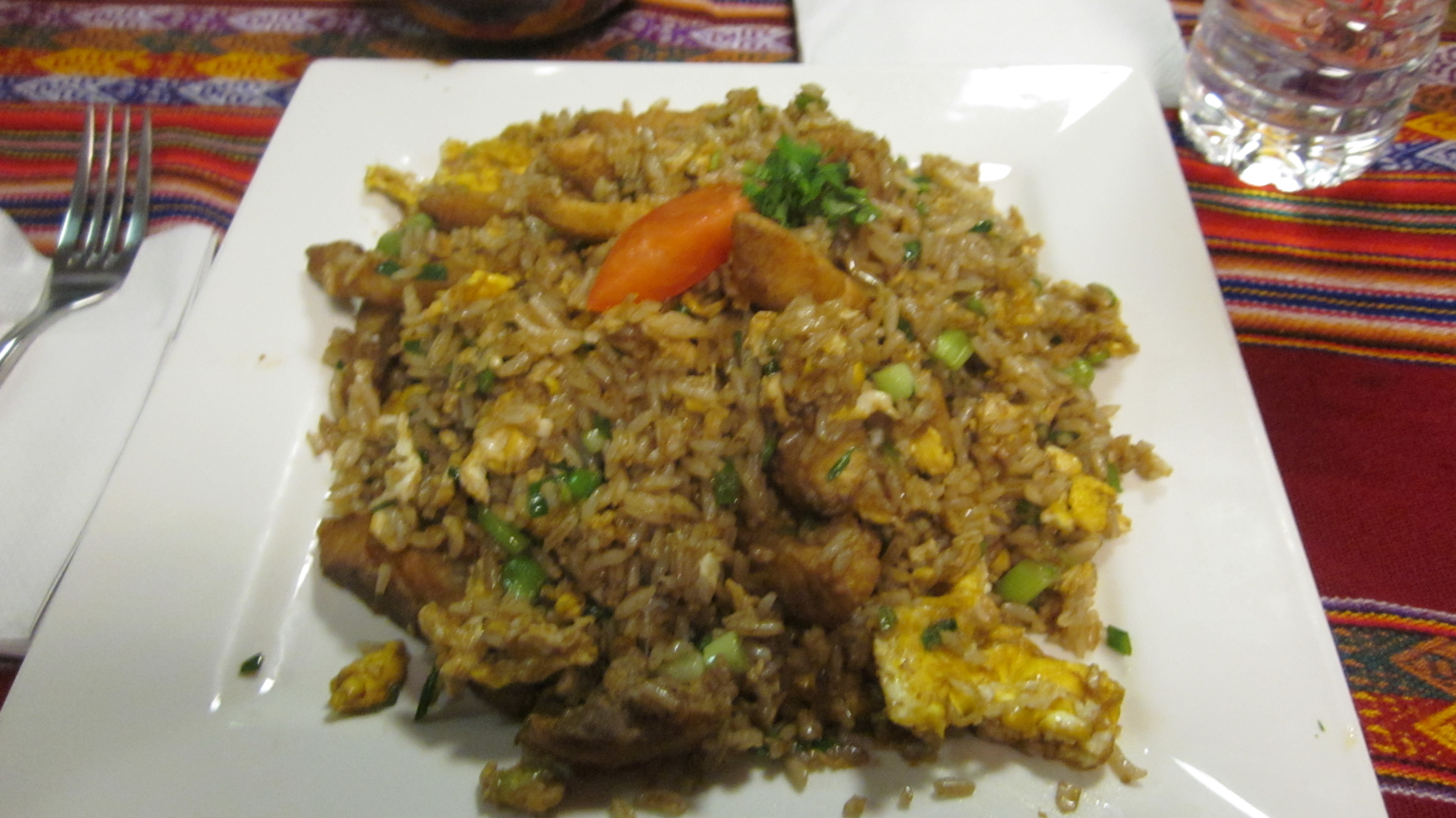 By the time the various seafood dishes we ordered arrived, I was able to unzip my jacket. But as soon as I moved my fork through the mound of fried rice, soggy potatoes, and equally soggy fried fish, shrimp, and squid that made up my “saltado pescado, I had to stop and swat at an army of gnats that were hovering around my plate. I added each of the three hot sauces to my dish, pale green, green, and red, hoping the spice would keep the gnats away, but more seemed to arrive.