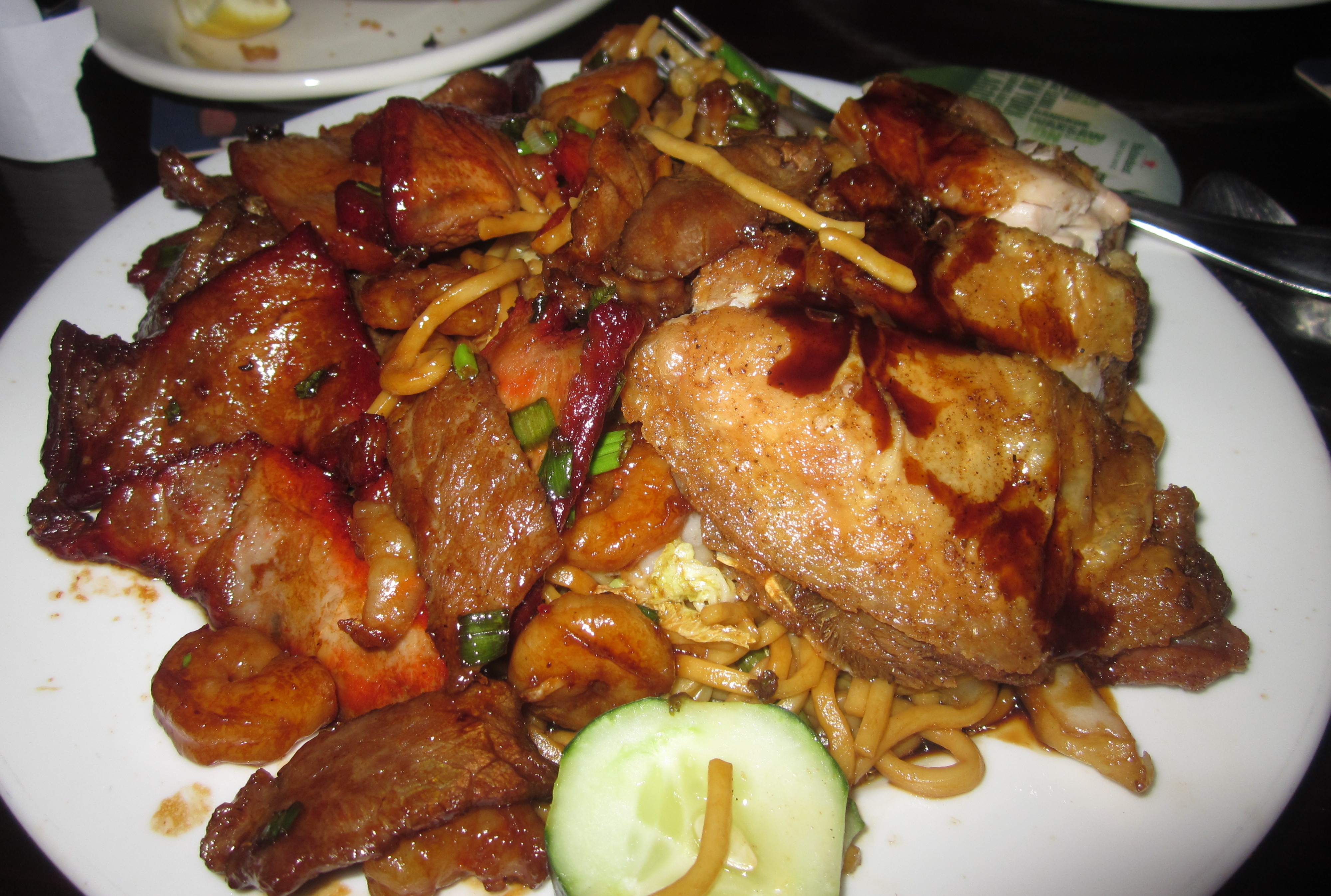 The portions were enormous; the mix in my chow mein included shrimp, beef, roast pork, duck, jerk chicken and vegetables. The noodles, as I expected were soggy but the vegetables crisp enough to compensate. The only real disappointment was the lack of spice from the jerk chicken, but the accompanying hot sauce more than made up for the lack of heat.