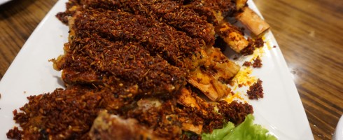 Just as we were finishing the pork, the majestic and sizable Muslim lamb chop was centered on our table. The crust of cumin, chili peppers, sesame seeds and other Middle-Eastern spices obscured the chops that looked more like a half a rack of baby back ribs. Though Dongbei cuisine is not noted for its spice, after a few bites through the thick crust on the lamb, a slow burn along the lips and inside the mouth took over appealing to our masochistic tendencies. Each rib was hefty enough to satisfy our well documented appetites, but Mike from Yonkers went back for more; the ribs were piling up on his plate.