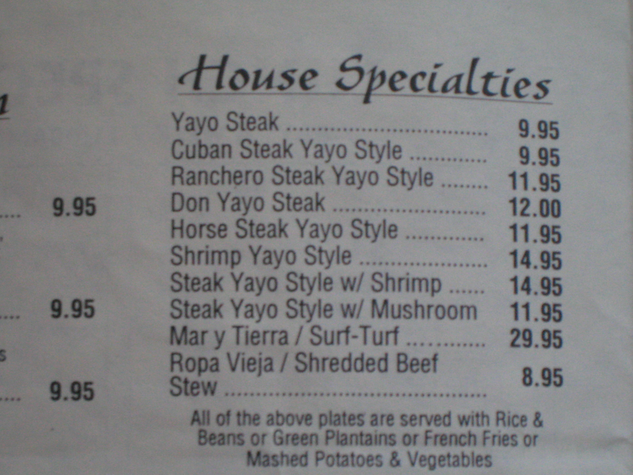 My son, the one mentioned being born just a few weeks before we visited El Viejo Yayo #2, will turn seven in a little over a month. Why does it feel then, like I was just there? And he was just a baby. Okay, that’s as deep as you’ll get me to go here.  I’ve not returned to El Viejo Yayo but from what I’ve gathered on the internet, it has not changed much. There is still a number one (36 Fifth Avenue, Brooklyn) and a number 2, the one we experienced. It now has a website (www.elviejoyayo.com) and the menu, with a few minor deletions and additions, and, of course price increases due to inflation, has remained the same though El Viejo Yayo #1 seems a bit more stylish and doesn’t have the noted Italian or Mexican corners.
