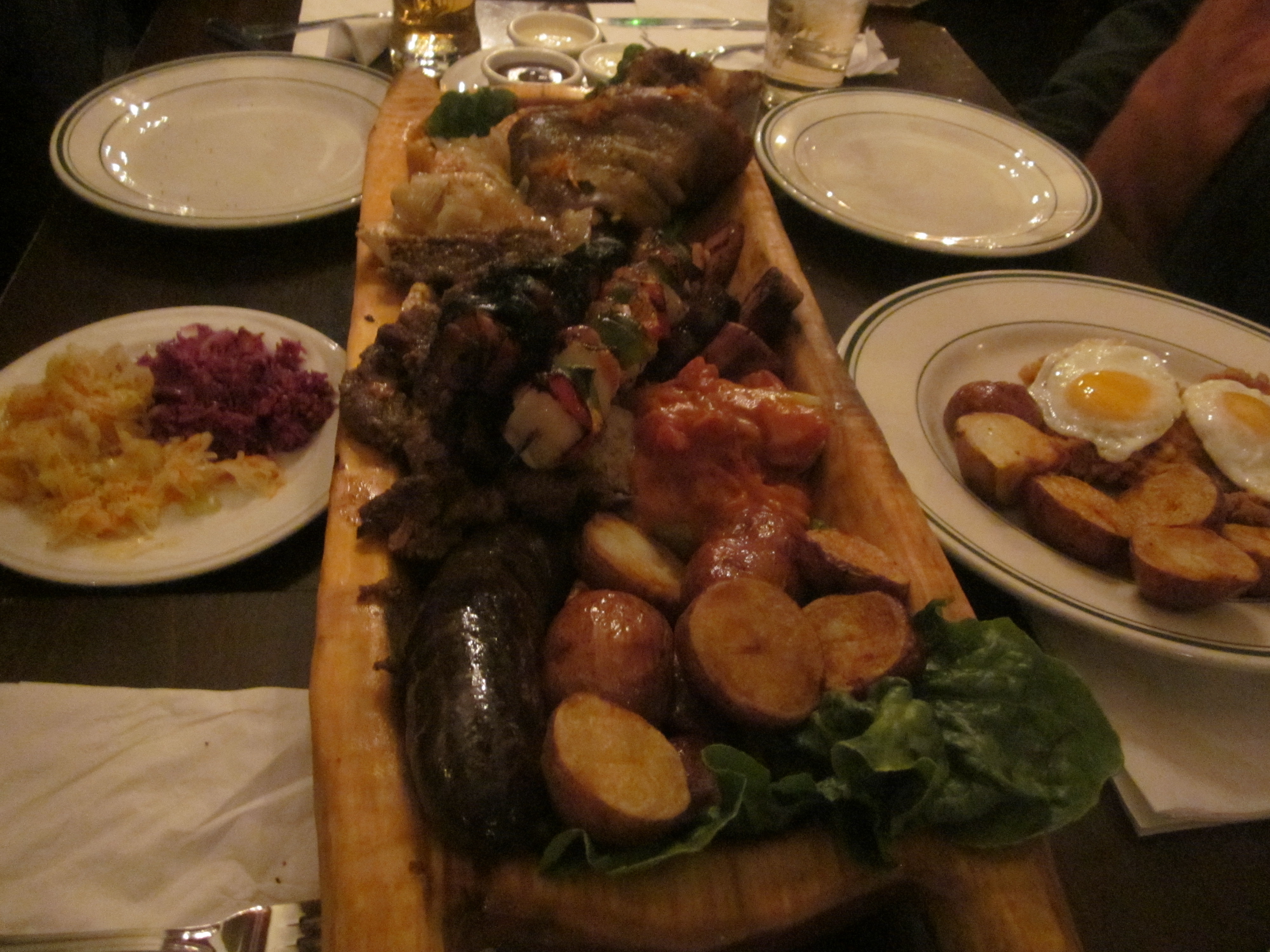 While we waited for our feast, we sipped a Polish beer recommended by the waitress called Lech. The beer was a disappointment, the Polish equivalent of Michelob, but the enormous wooden platter shaped like a hollowed out boat filled with meats that arrived promptly was not.